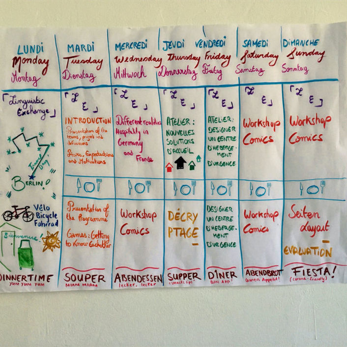 Mit offenen Armen ist ein deutsch-französisches Projekt, das vom 14. bis zum 21. September 2020 in Berlin stattfand. Der Austausch verfolgt das Ziel, gemeinsam Fragen der einladenen Stadt zu formulieren, insbesondere über den Empfang und die Unterbringung von neu angekommenen Menschen in der Stadt. Zusammen mit unserem Partner Quatorze (Frankreich) und unseren Teilnehmer*innen versuchen wir durch architektonische Gestaltungsmittel eine Lösung für die Aufnahme von neuen Leuten zu finden, um uns über neue Räumlichkeiten bewusst zu werden. Es ist eine Gelegenheit, darüber nachzudenken, was das Gefühl von "Zuhause" ausmacht, welche Faktoren die Aneignung eines Raumes ermöglichen und welche Möglichkeiten der Freiheit in unseren Städten und auf dem Lande bleiben. Das Projekt ist auch die Gelegenheit, über die Themen Migration und Mobilität zu reflektieren. Dies machten wir nämlich auch über die Live-Comic-Technik.